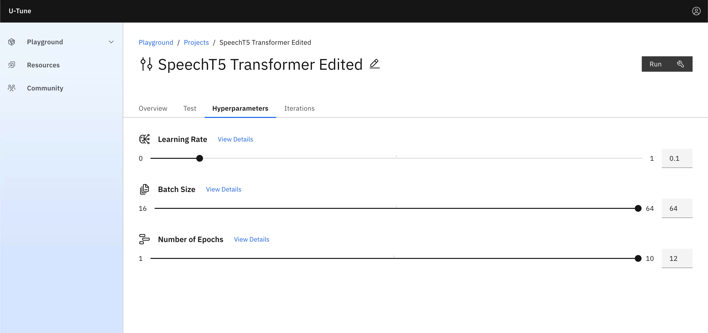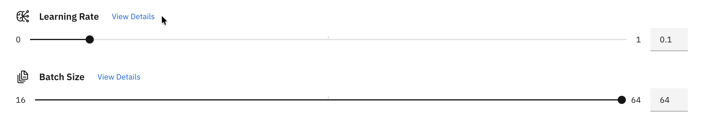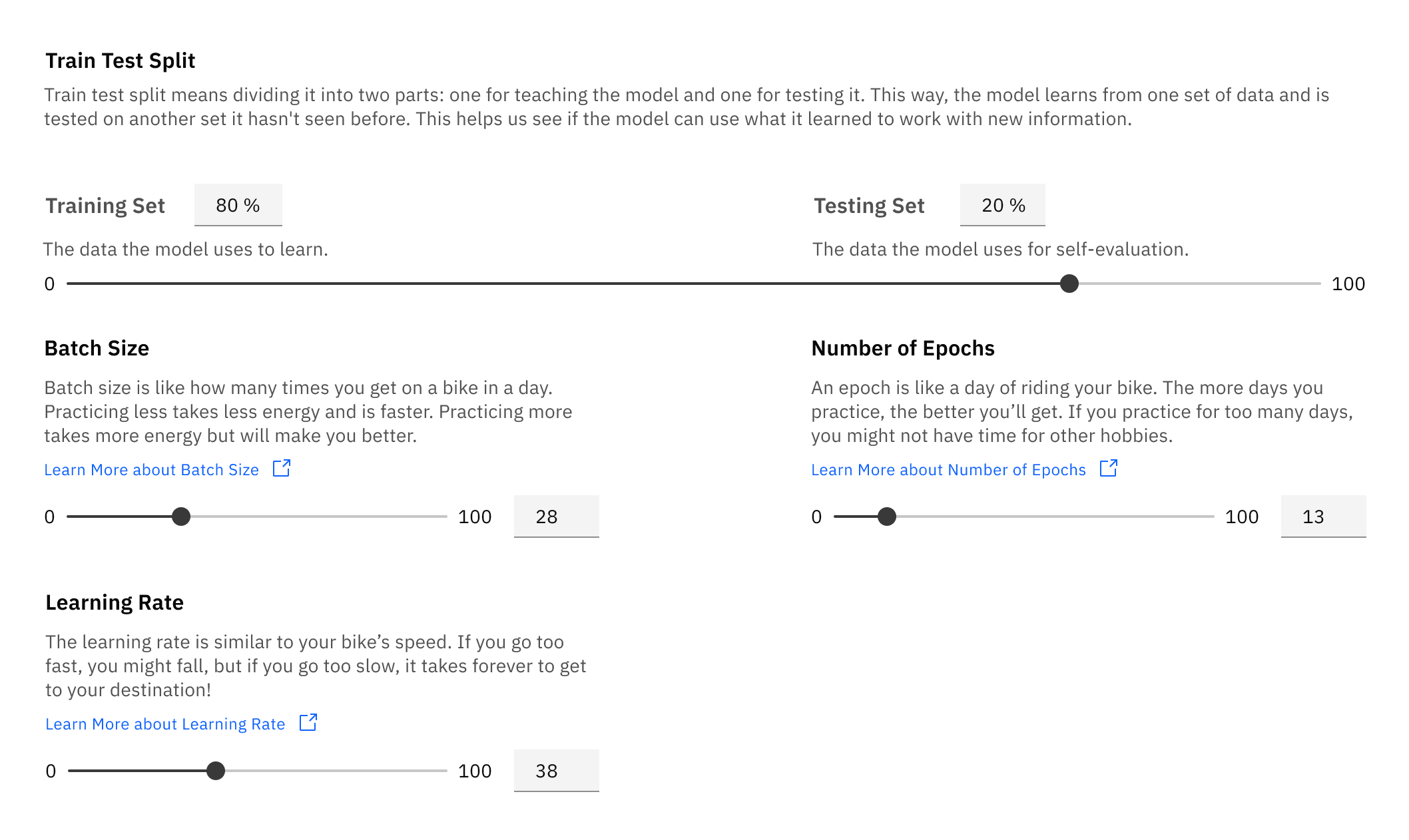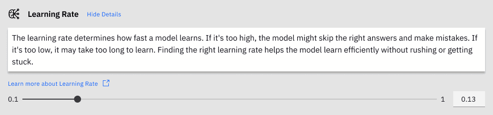 Hyperparameter tuning is one of the most important, but also the most confusing, steps in fine-tuning. To reduce struggles with jargon and unclear parameter effects, a slider-based input with simplified definitions was designed and presented in an accordion-style layout for clarity.