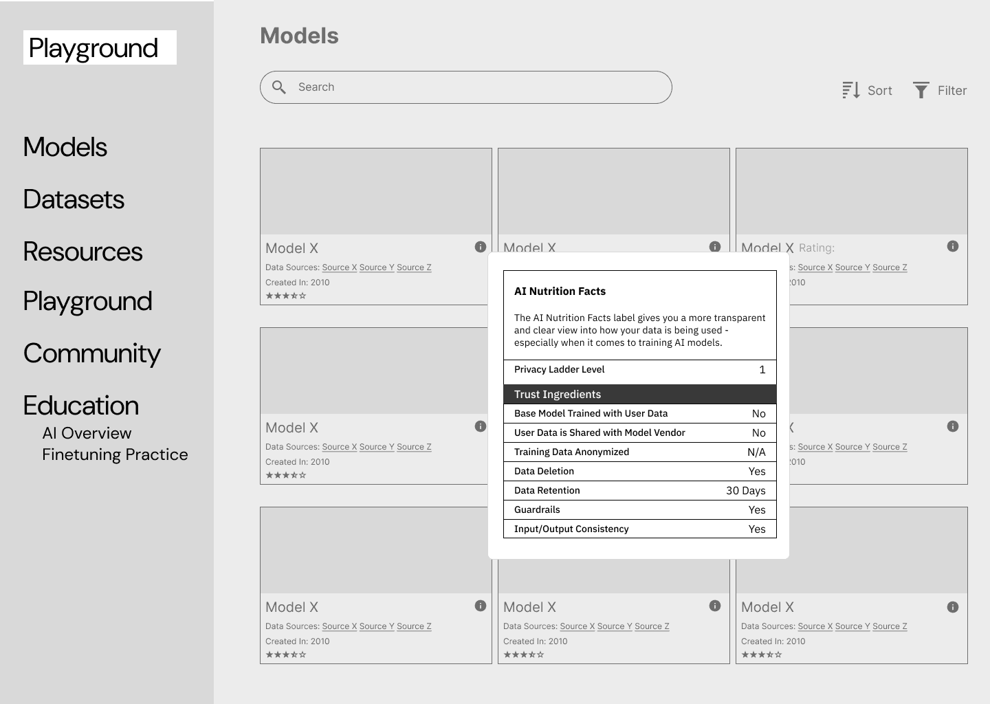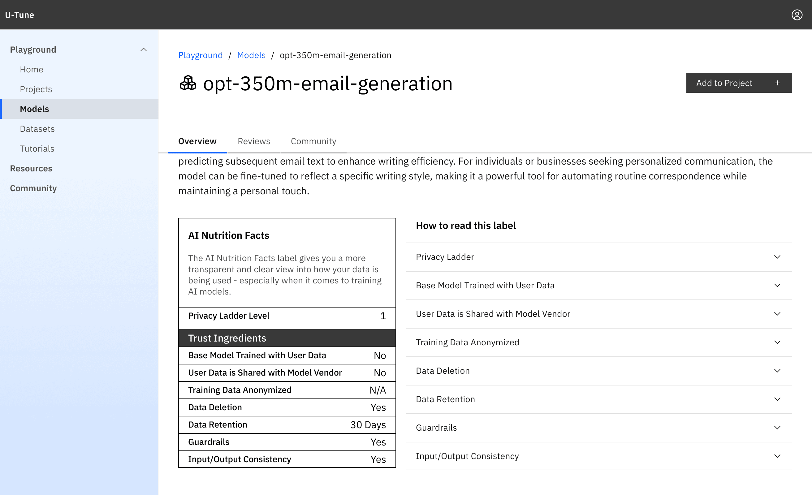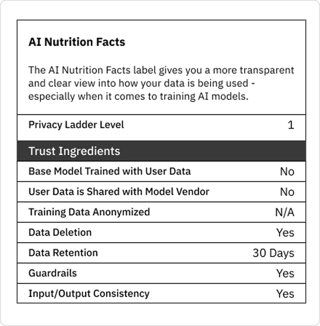 Trust in fine-tuning is often undermined by uncertainty around how data is retained, processed, and used. Inspired by Twilio and modeled after food nutrition labels, an AI Nutrition Facts label was introduced to surface model data practices in a clear, interpretable format.