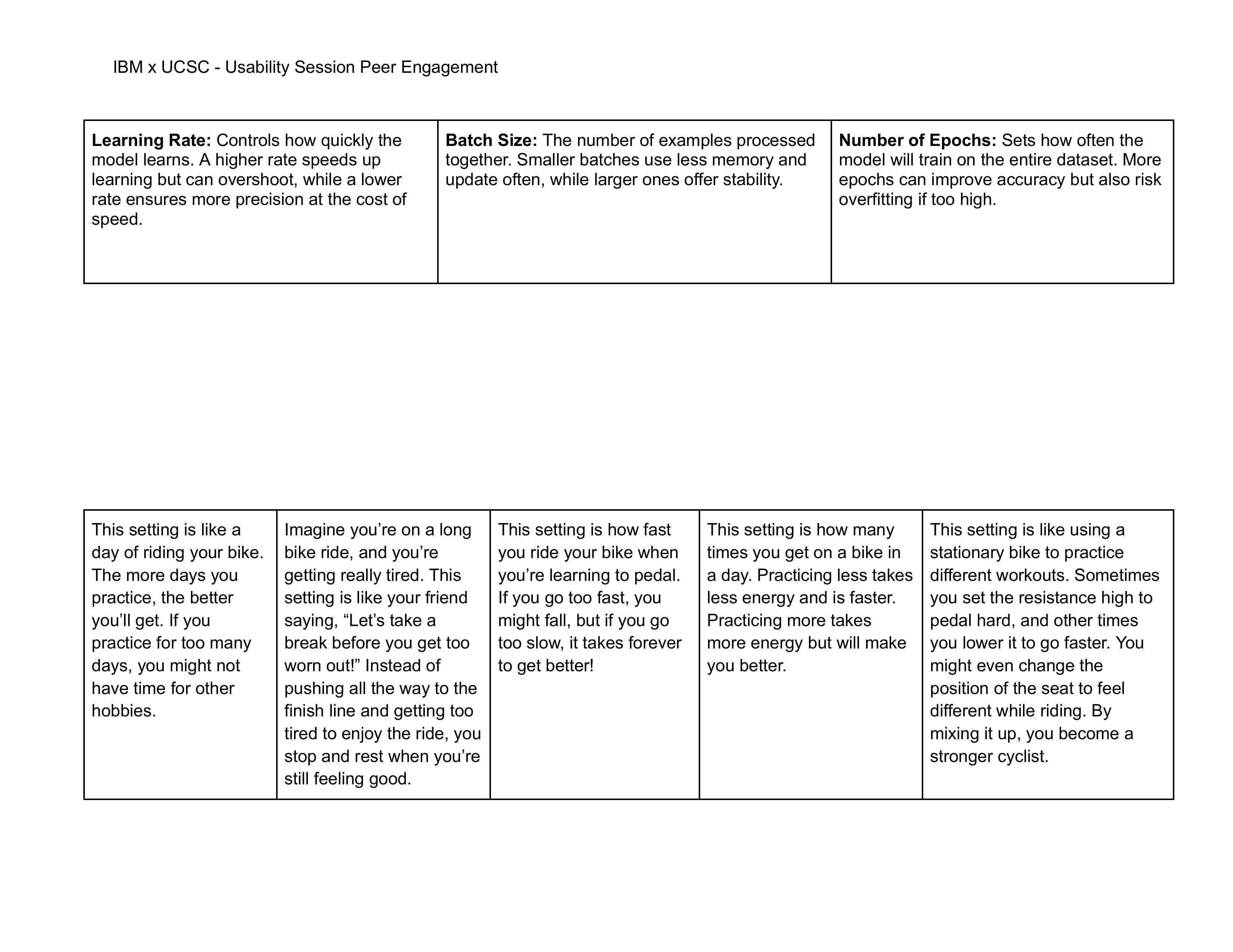 The first tested iteration explored analogy-based explanations, like riding a bike, to make parameters more approachable.